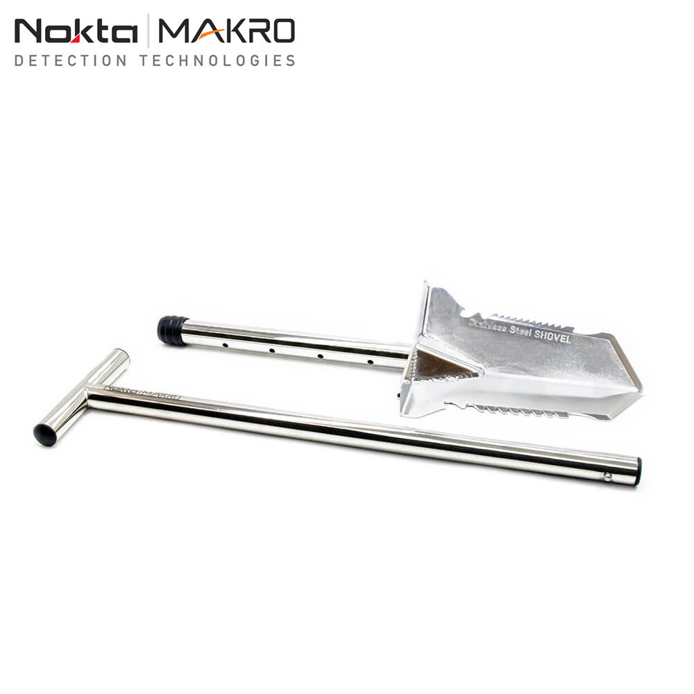 Fabriquée en Turquie par Nokta-Makro, cette pelle se démonte en 2 parties pour tenir dans votre sac à dos. Vous pouvez de surcroit la régler à votre taille de 80 à 97cm. Sa lame de 24cm comporte des dents de chaque coté ainsi qu'une graduation. Elle pèse 1.7kg.