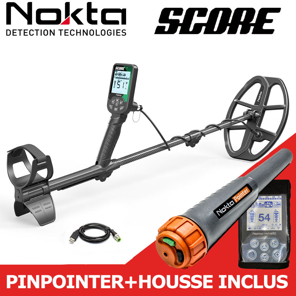 Pinpointer étanche NoktaPointer +housse offerts. Le NOKTA SCORE est un détecteur de métaux multifréquence étanche offrant un rapport qualité prix jamais-vu. C'est le seul détecteur multifréquence simultané (SMF) à la fois étanche à 5m, doté d'une canne télescopique, d'un émetteur pour casque sans fil (optionnel) et d'une batterie rechargeable. Cette technologie SMF qui équipe également le LEGEND permet de mieux identifier les cibles notamment à proximité d'objets en fer et de détecter sur tout type de terrain et même à la plage. A moins de 500eur, aucun autre détecteur n'offre de telles possibilités d'autant que vous pouvez le mettre à jour via USB. Autonomie 12h, poids 1.2kg, garantie 3 ans. Plusieurs versions au choix (avec ou sans casque sans fil + avec ou sans disque 35cm)