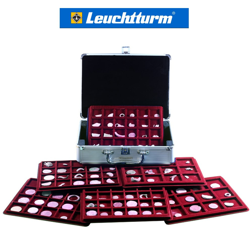 Contrairement aux mallettes petit prix "sans marque" vendues chez nos concurrents, cette valisette est fabriquée par la marque allemande LEUCHTURM, référence pour la numismatique et la philatélie. Elle est d'une très bonne qualité; les monnaies se renverseront pas une fois la valise à la verticale. Elle est livrée complète avec 6 plateaux en feutrine bleue avec des compartiments de diverses tailles pouvant accueillir jusqu'à 112 monnaies de tout type.