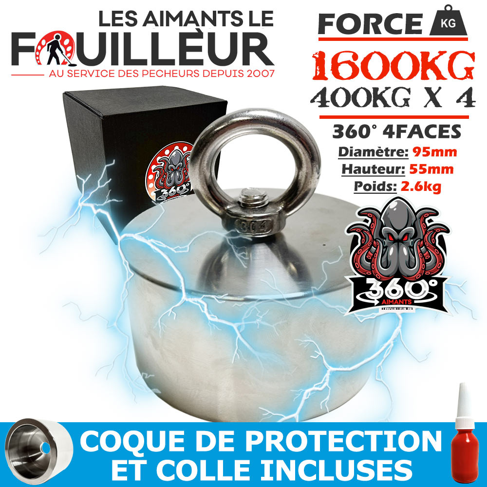 Cet aimant 360° est le plus puissant disponible sur le marché parmi tous les aimants néodyme. Il aimante sur toutes les faces et permet de soulever jusqu'à 1600 kg (400kg à peu près par face). Contrairement aux autres aimants 360° du marché la coque de protection renforcée de 4mm est incluse. En plus de la coque, cet aimant est de surcroit protégé par un triple traitement Nickel (Ni-Cu-Ni) de 12 micromètres afin de lui garantir une durée de vie optimale. Poids 2.6kg. Dimension 95x55mm. Colle / Frein filet inclus