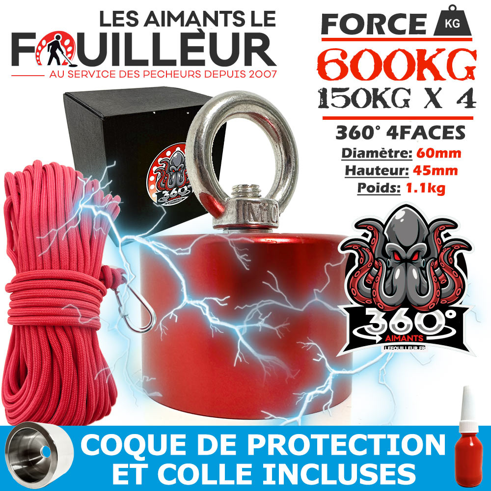 Cet aimant 360° permet de bien débuter sans ce ruiner. Il aimante sur toutes les faces et permet de soulever jusqu'à 600 kg (150kg à peu près par face).Contrairement aux autres aimants 360° du marché la coque de protection renforcée de 4mm est incluse. En plus de la coque, cet aimant est de surcroit protégé par un triple traitement Nickel (Ni-Cu-Ni) de 12 micromètres afin de lui garantir une durée de vie optimale. Poids 1.1 kg. Dimension 60x45mm. Frein filet/collet pour anneau de serrage incluse. Corde incluse