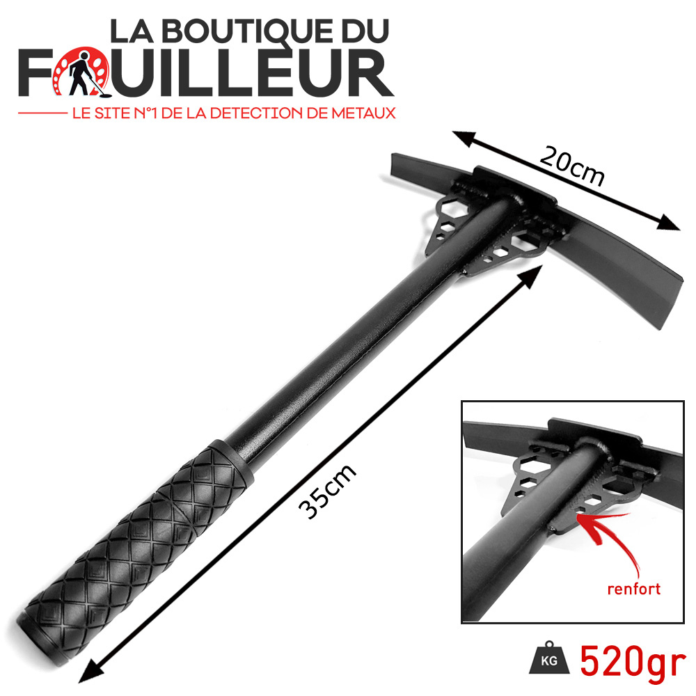 Le Piochon Lefouilleur est résistant et très léger. Il ne pèse que 520g ! Son manche mesure 35cm et sa lame 20x4cm. Il est équipé d'un grip et peut facilement s'accrocher à la ceinture grâce aux trous dans les renforts sous la lame.