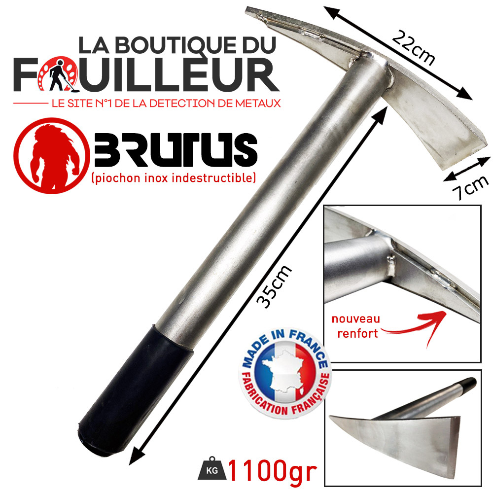 Contrairement aux autres modèles, le piochon BRUTUS est en inox. Indestructible, il s'usera beaucoup moins que les autres piochons du marché en acier forgé. Il s'agit ici de la nouvelle version avec pointe renforcée. Il ne pèse que 1.1 kg, son manche mesure 35cm et sa lame 22x7cm. Il est équipé d'un grip. Il est fabriqué par un artisan en France sous le label LEFOUILLEUR.
